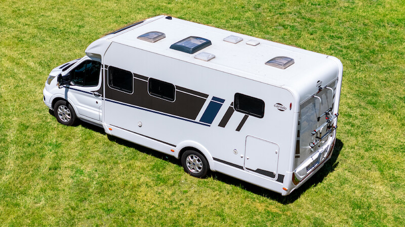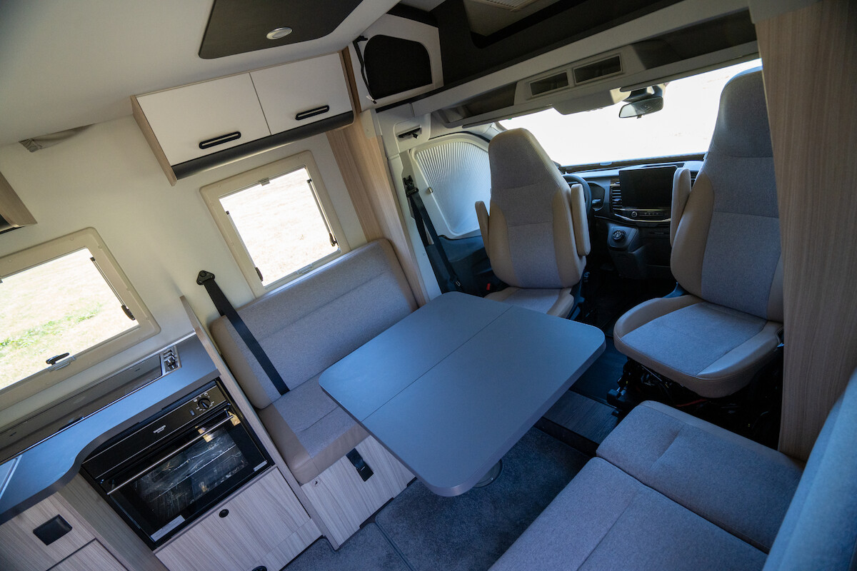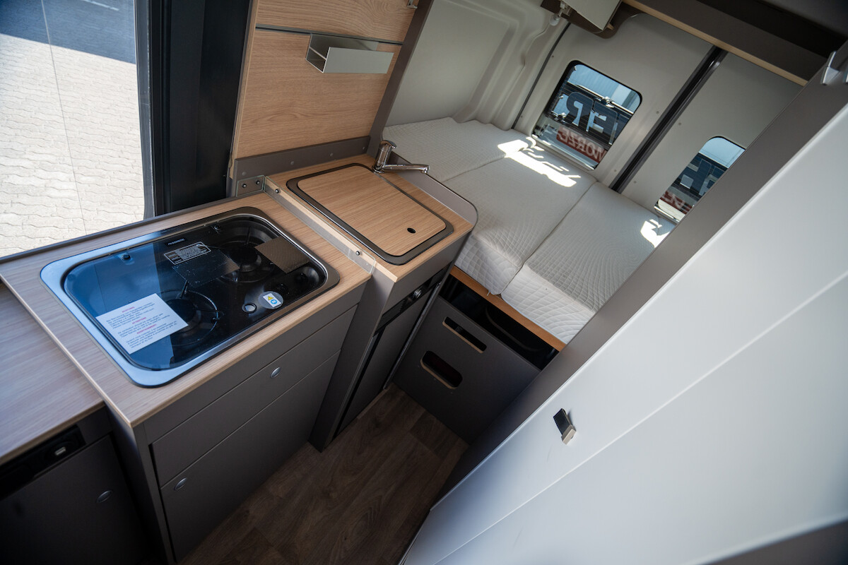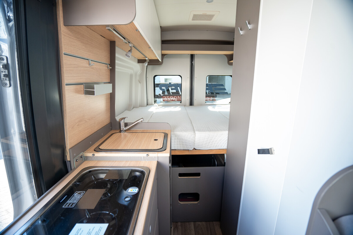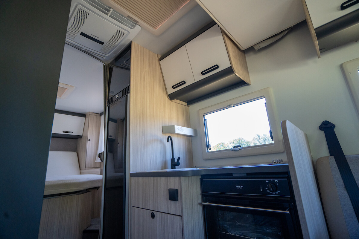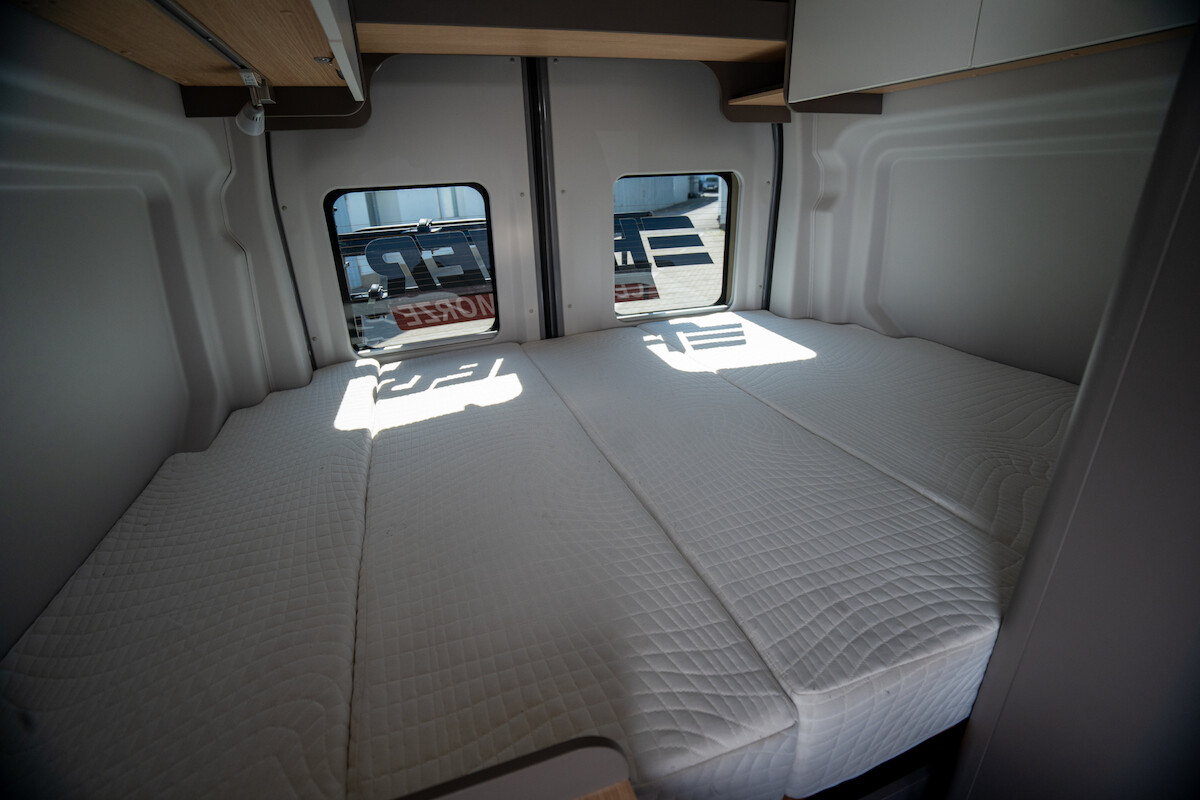 Carado, będące częścią niemieckiej grupy Hymer, również oferuje dwa miejsca do spania – w tylnej części pojedyncze łóżka z możliwością połączenia w jedno duże, oraz dodatkowe miejsce do spania w salonie. W części wypoczynkowej można wygospodarować miejsce dla nawet pięciu osób, a dzięki kompaktowej konstrukcji udało się zmieścić kuchnię w kształcie litery L z trzypalnikową kuchenką gazową.